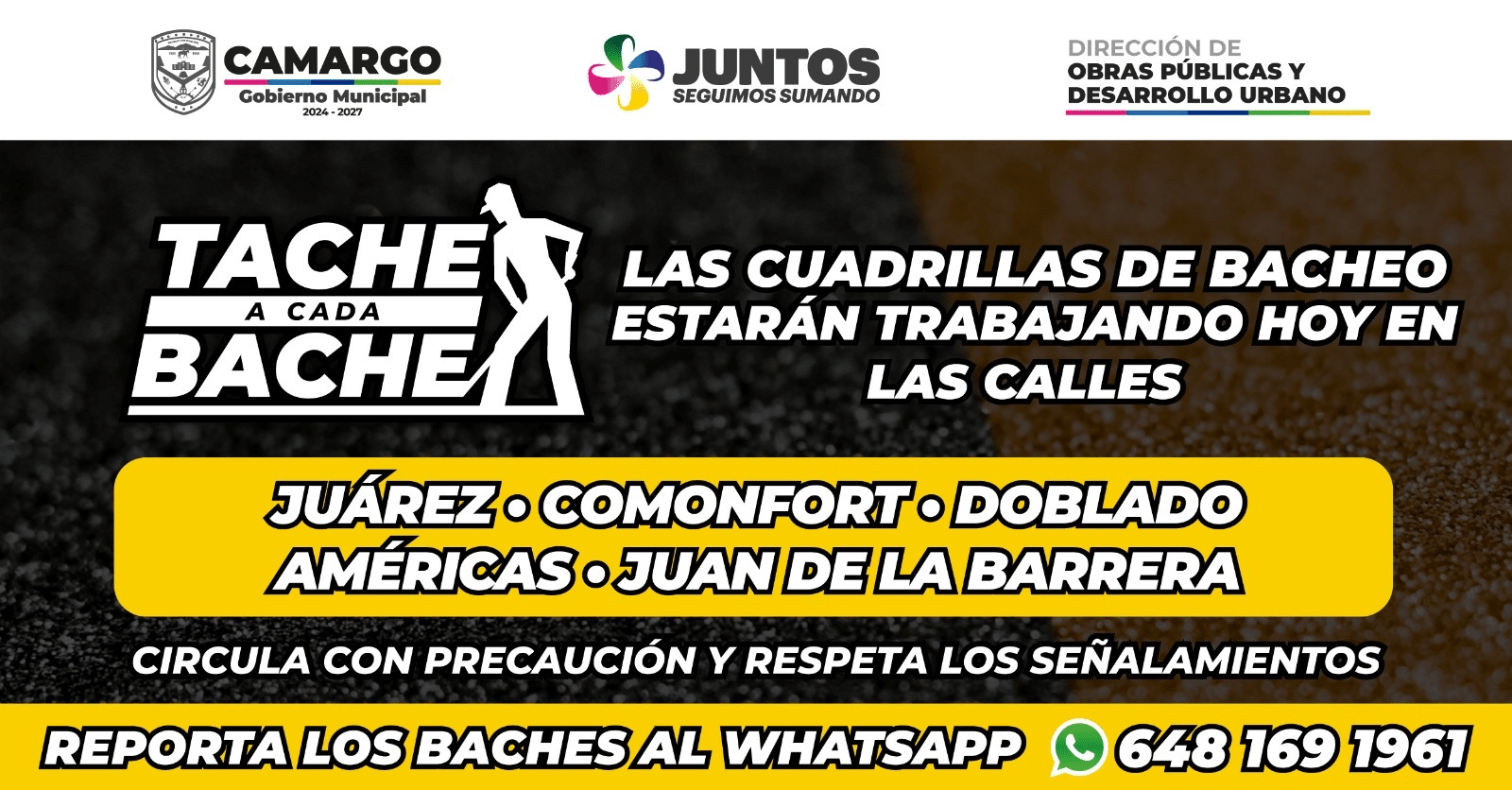 El Gobierno Municipal de Camargo, a través de la Dirección de Obras Públicas y Desarrollo Urbano, informa que este día las cuadrillas de bacheo estarán trabajando en distintos puntos de la ciudad como parte del programa “Tache a Cada Bache”.