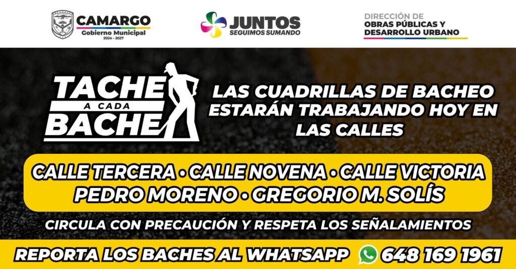 El próximo lunes se estarán realizando labores de bacheo en diversas vialidades de la ciudad como parte del programa municipal “Tache a cada bache”, que tiene como objetivo mejorar las condiciones de las calles y brindar mayor seguridad a los automovilistas.