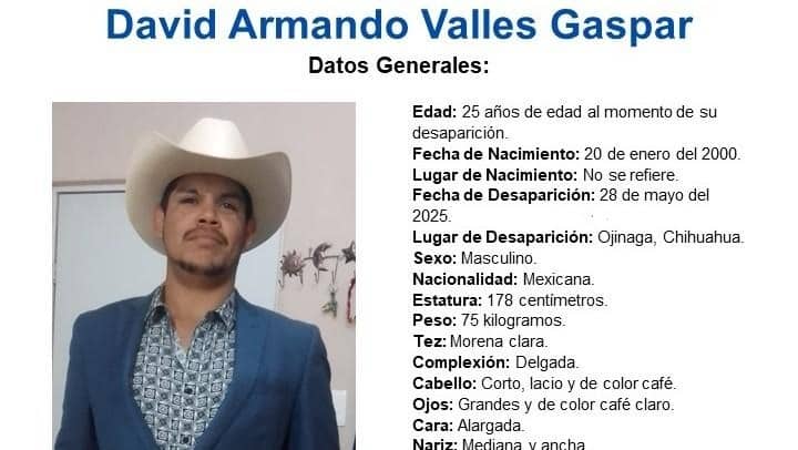La Comisión Local de Búsqueda del Estado de Chihuahua solicita el apoyo de la ciudadanía para dar con el paradero de David Armando Valles Gaspar, joven de 25 años que desapareció el pasado 28 de mayo de 2025 en el municipio de Ojinaga.