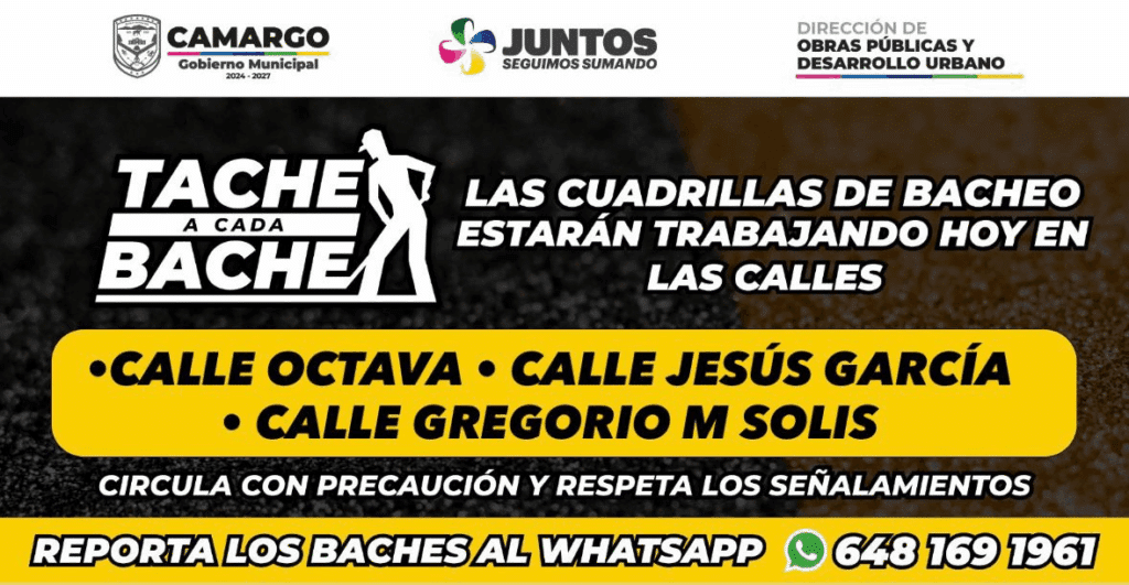 El Gobierno Municipal informa que, dentro del programa permanente “Tache a cada bache”, este miércoles se estarán realizando trabajos de bacheo en distintos puntos de la ciudad con el objetivo de mejorar la seguridad vial y las condiciones de nuestras calles.