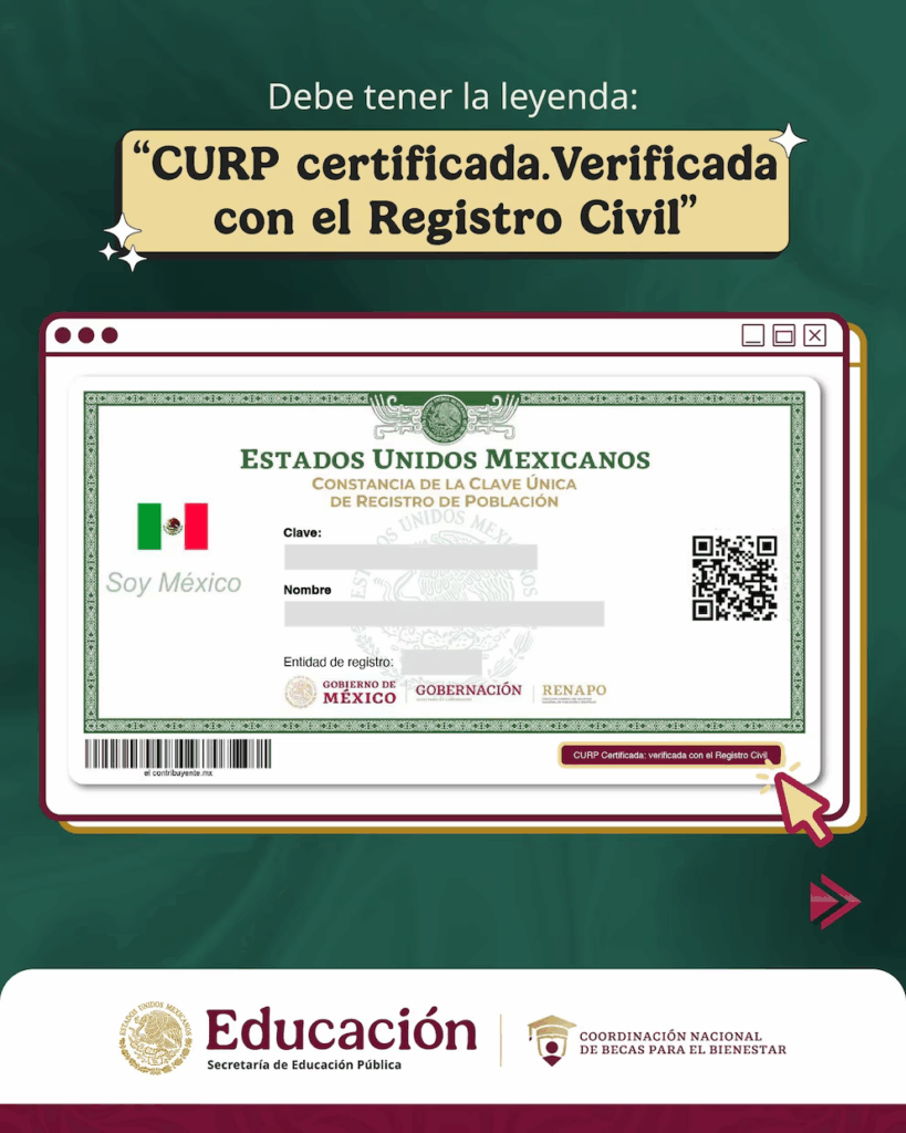 La Coordinación Nacional de Becas para el Bienestar Benito Juárez informó que será obligatorio contar con la CURP certificada para registrarse en el programa. Este documento verifica que los datos del estudiante coinciden con su acta de nacimiento en el Registro Civil.