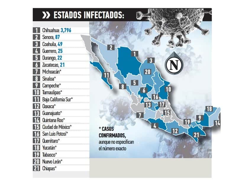 En las últimas 24 horas notificaron 21 nuevos casos a nivel nacional, 18 de ellos en territorio chihuahuense. La propagación del virus ya afecta a Sonora, con 87 casos confirmados; Coahuila, 49; Guerrero, 25; Durango, 22 y Zacatecas, 21.