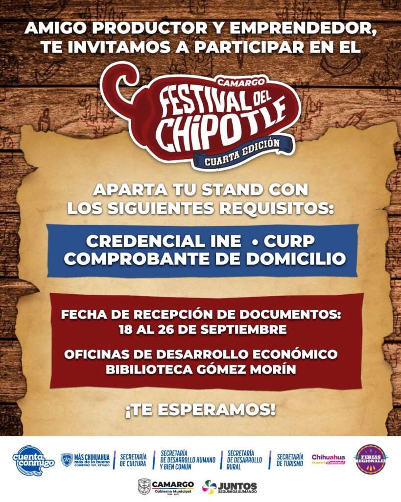 El Gobierno Municipal de Camargo, en coordinación con dependencias estatales, invita a productores y emprendedores a ser parte de la cuarta edición del Festival del Chipotle, uno de los eventos gastronómicos y culturales más importantes de la región.