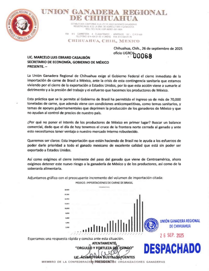 Camargo, Chih. – El presidente de la Asociación Ganadera Local, Alec Tanner, alertó sobre los efectos negativos que está generando el incremento en la importación de carne extranjera, principalmente de Brasil y de países de Centroamérica, situación que afecta directamente a los productores mexicanos.