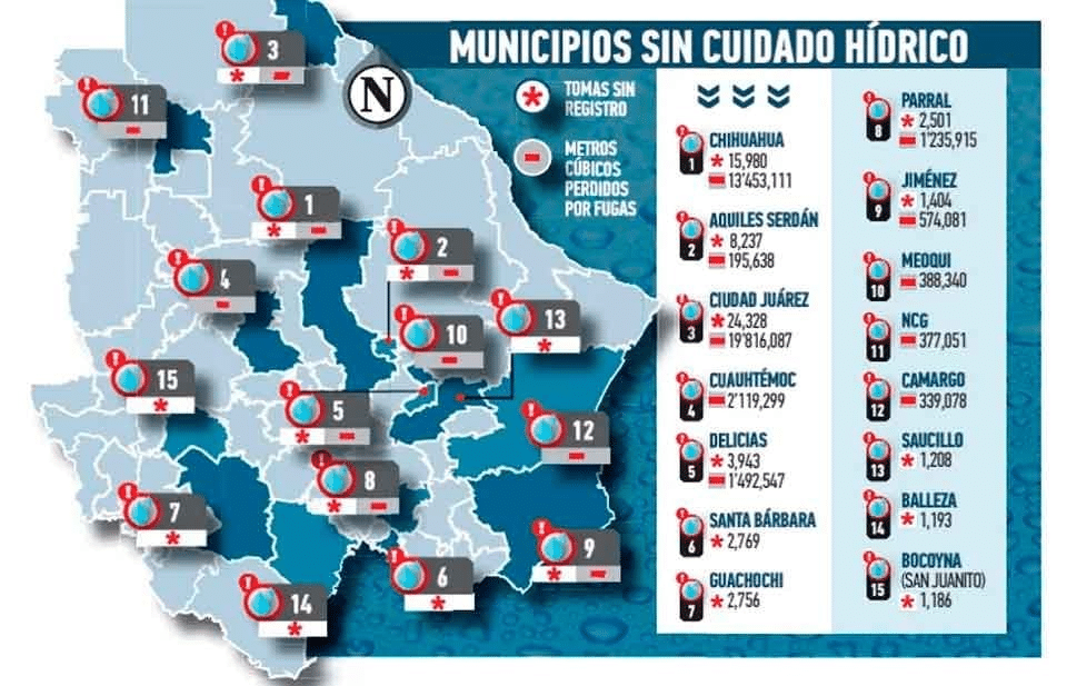 Hasta 13.4 Mm3 desperdiciados en la capital Respecto al agua desperdiciada por fugas, Chihuahua y Aquiles Serdán también destacan junto con Juárez y Cuauhtémoc.