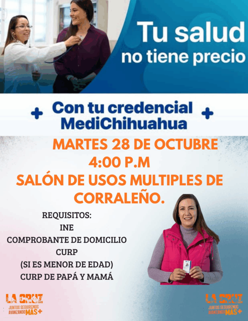 Este martes, a partir de las 4:00 de la tarde, la comunidad de Corraleño recibirá la visita de MEDI Chihuahua, un programa del Gobierno del Estado que busca acercar los servicios médicos y promover la afiliación de la población a este importante esquema de atención.