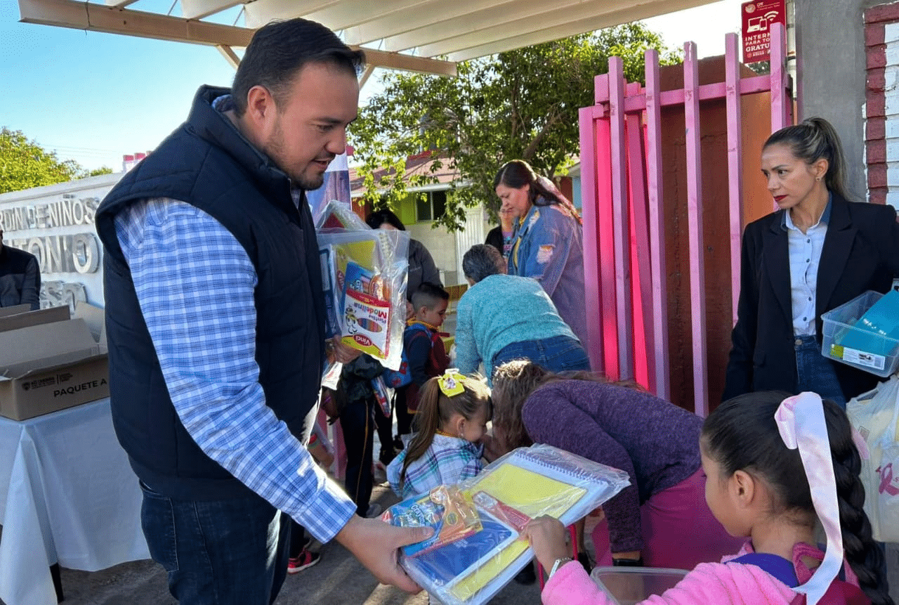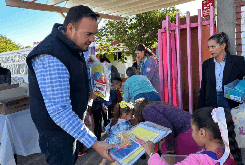 Camargo, Chih.– Esta mañana, el presidente municipal Jorge Aldana encabezó la entrega de útiles escolares en la escuela primaria Adolfo López Mateos y en el preescolar Antonio Casso, como parte del programa que busca garantizar que todas las niñas y niños de Camargo cuenten con las mismas oportunidades para iniciar bien el ciclo escolar.