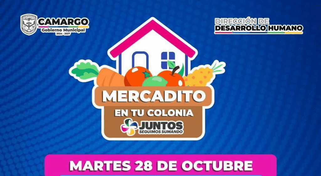 El Gobierno Municipal de Camargo, a través de la Dirección de Desarrollo Humano, invita a las familias de las colonias San Isidro, Obrera y Villa Diamante a participar en una nueva edición del programa “Mercadito en tu Colonia”, que se llevará a cabo este martes 28 de octubre en la Escuela Primaria Adolfo López Mateos, a partir de las 4:30 de la tarde.