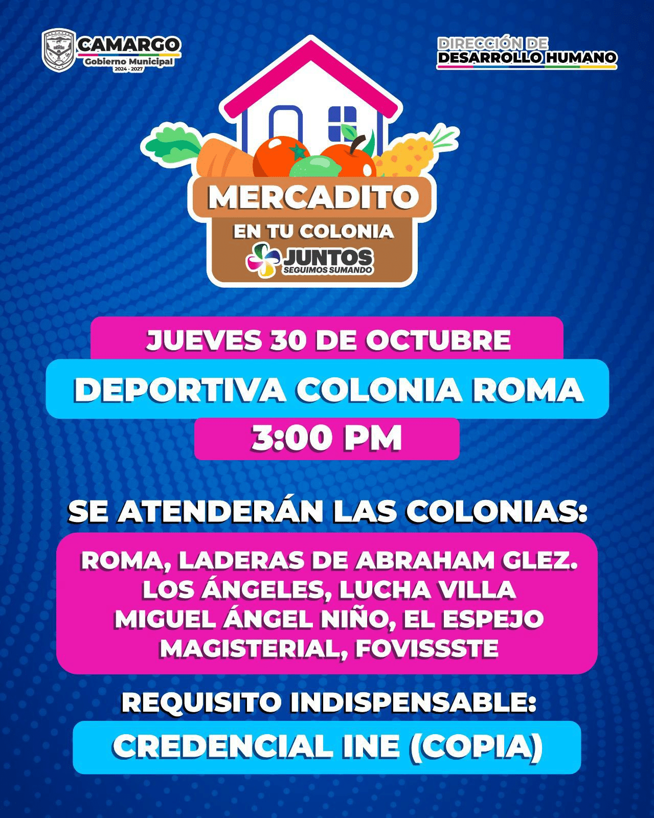 Este jueves 30 de octubre, el Mercadito se instalará en la Deportiva de la Colonia Roma a partir de las 3:00 de la tarde, donde se atenderá a vecinas y vecinos de las colonias Roma, Laderas de Abraham González, Los Ángeles, Lucha Villa, Miguel Ángel Niño, El Espejo, Magisterial y FOVISSSTE.