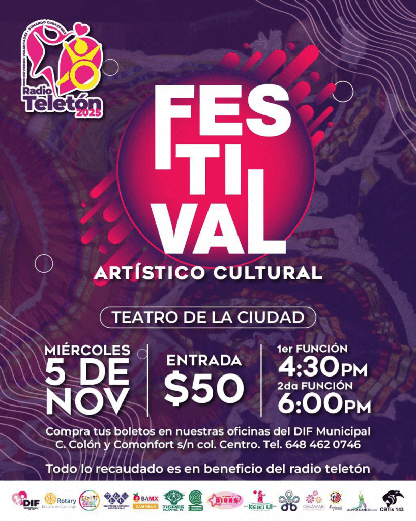 El DIF Municipal de Camargo invita a todas y todos los camarguenses a disfrutar del Festival Artístico Cultural del Radio Teletón 2025, un evento lleno de talento, música y presentaciones que tiene como objetivo recaudar fondos en apoyo a esta noble causa.