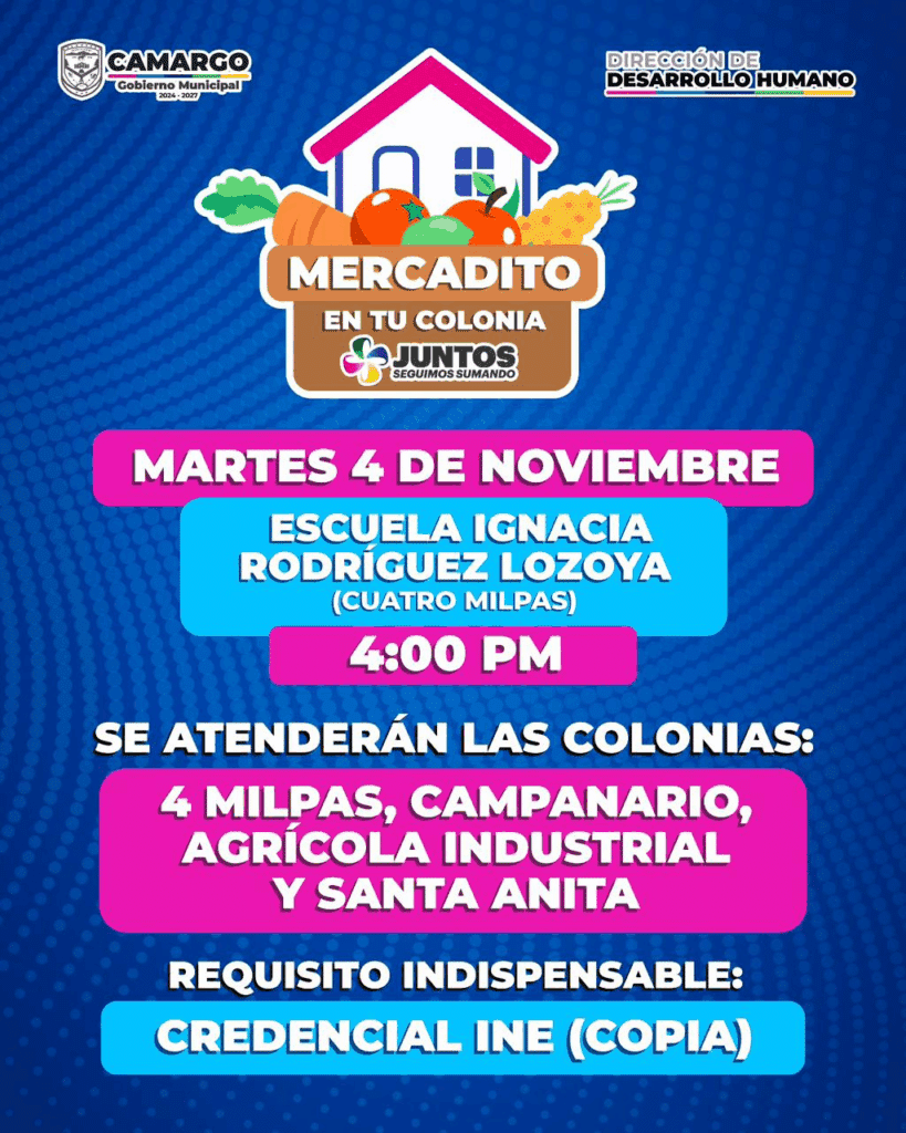 El Gobierno Municipal de Camargo, a través de la Dirección de Desarrollo Humano, invita a las y los ciudadanos a participar en el programa “Mercadito en tu Colonia”, una iniciativa que busca acercar productos de la canasta básica a precios accesibles, fomentando la economía familiar y el bienestar de las y los camarguenses.
