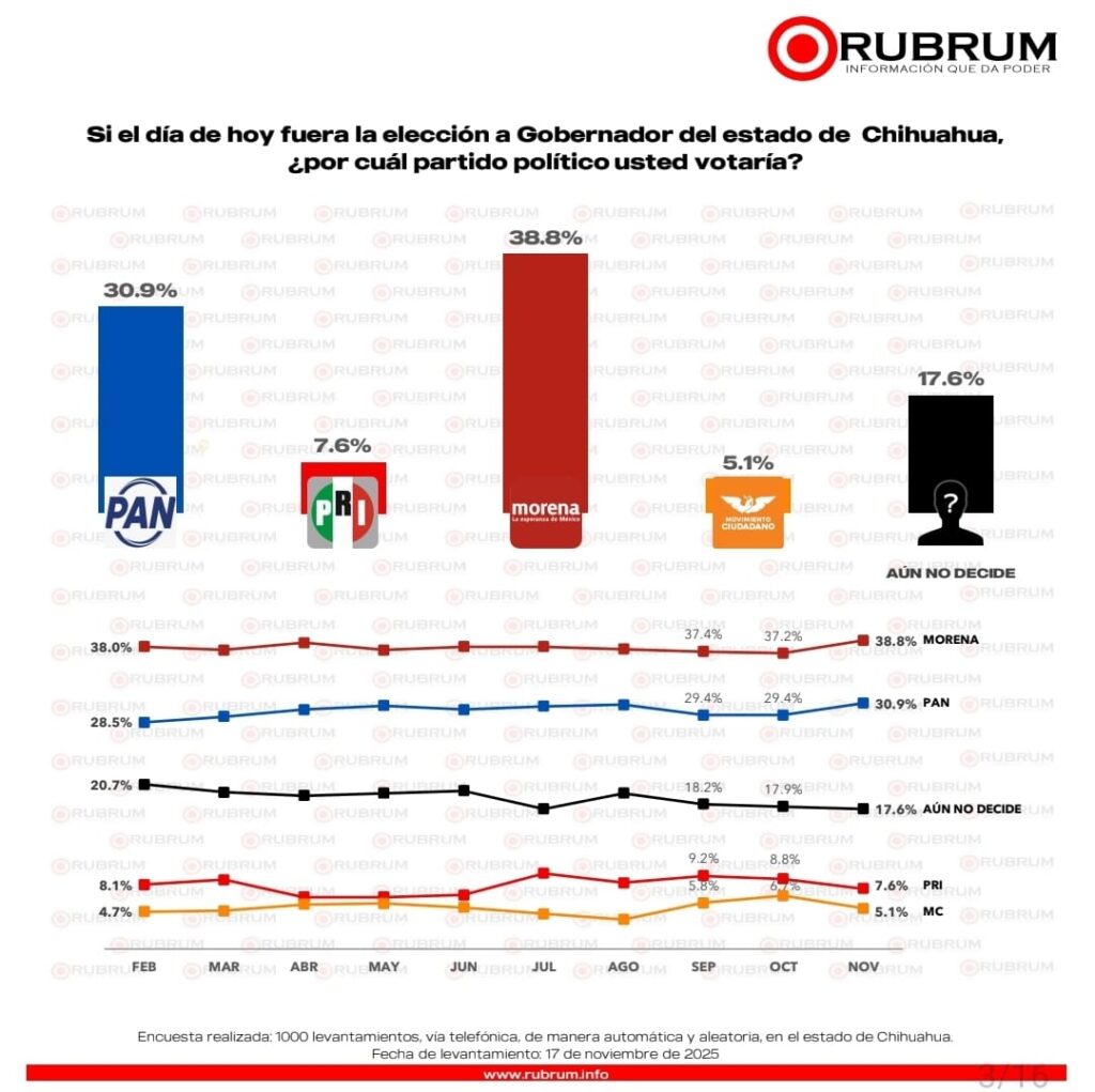 Chihuahua.— La encuestadora Rubrum presentó su medición más reciente correspondiente a noviembre de 2025, en la que Morena aparece a la cabeza en la intención de voto para la gubernatura de Chihuahua rumbo al proceso electoral de 2027.