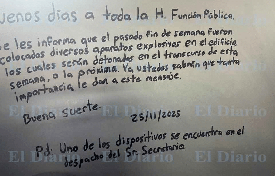 Se les informa que el pasado fin de semana fueron colocados diversos aparatos explosivos en el edificio, los cuales serán detonados en el transcurso de esta semana, o la próxima, Ya ustedes sabrán que tanta importancia le dan a este mensaje:Buena suerte.25/11/2025Pd. Uno de los dispositivos se encuentra en el despacho del Sr. Secretario”.
