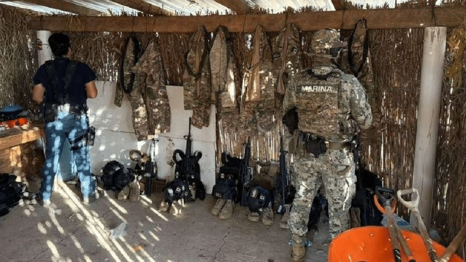 Durante el operativo fueron aseguradas seis armas largas, 27 cargadores, 760 cartuchos útiles, 13 chalecos balísticos, 19 cascos balísticos y 14 pares de botas, así como equipo táctico y 54 dosis de metanfetamina.