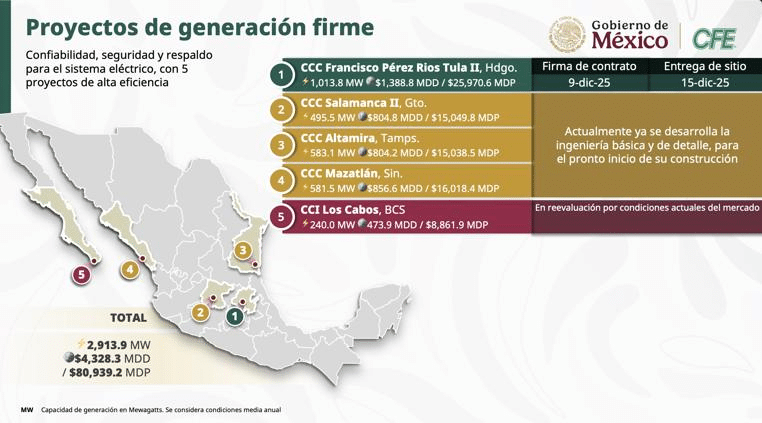 Asimismo, detalló que las centrales de Salamanca, Altamira y Mazatlán se encuentran en fase de desarrollo de ingeniería para iniciar obras en el corto plazo, mientras que el proyecto de Los Cabos está en proceso de reevaluación para ajustarse a las condiciones actuales del mercado. Estos proyectos dijo permitirán aprovechar infraestructura existente, reducir tiempos de ejecución y disminuir costos y riesgos técnicos.