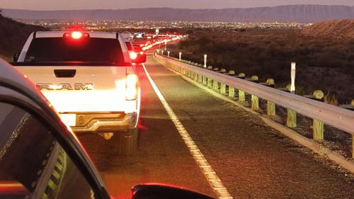 Como ella, desde la madrugada, otros viajeros compartieron fotografías de las gigantes filas, de varios kilómetros, que se extienden por la carretea, cruzando todo lo largo de la localidad de Presidio.
