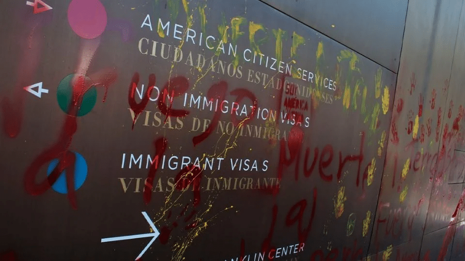 El anuncio ocurre después de manifestaciones registradas desde el sábado en las inmediaciones de la sede diplomática, donde también se reportaron actos de vandalismo en la fachada de la sede, mientras elementos de seguridad contuvieron a los protestantes en la zona.