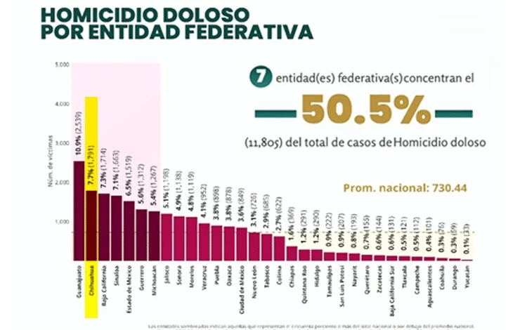 El estado de Chihuahua cerró 2025 como el segundo lugar de homicidios en el país, de acuerdo con la información anual del Gabinete de Seguridad Nacional expuesta esta mañana en la Conferencia de Prensa de la Presidencia de la República, la cual en esta ocasión fue realizada en Cuernavaca, Morelos.
