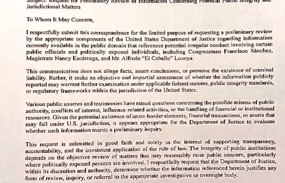 Mario Arturo Pico Castañeda, asesor del Gobierno de Texas, envió al FBI la solicitud de investigación el pasado 6 de enero de 2026 con copia ql Departamento de Estado, pidiendo una investigación imparcial y objetiva.