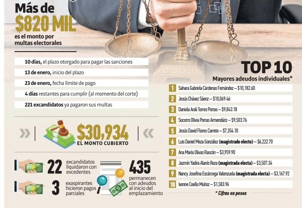 En conjunto, los 435 excandidatos multados adeudan poco más de 820 mil pesos por concepto de multas derivadas de omisiones, inconsistencias y faltas en la comprobación de gastos de campaña, así como aportaciones observadas durante la fiscalización.