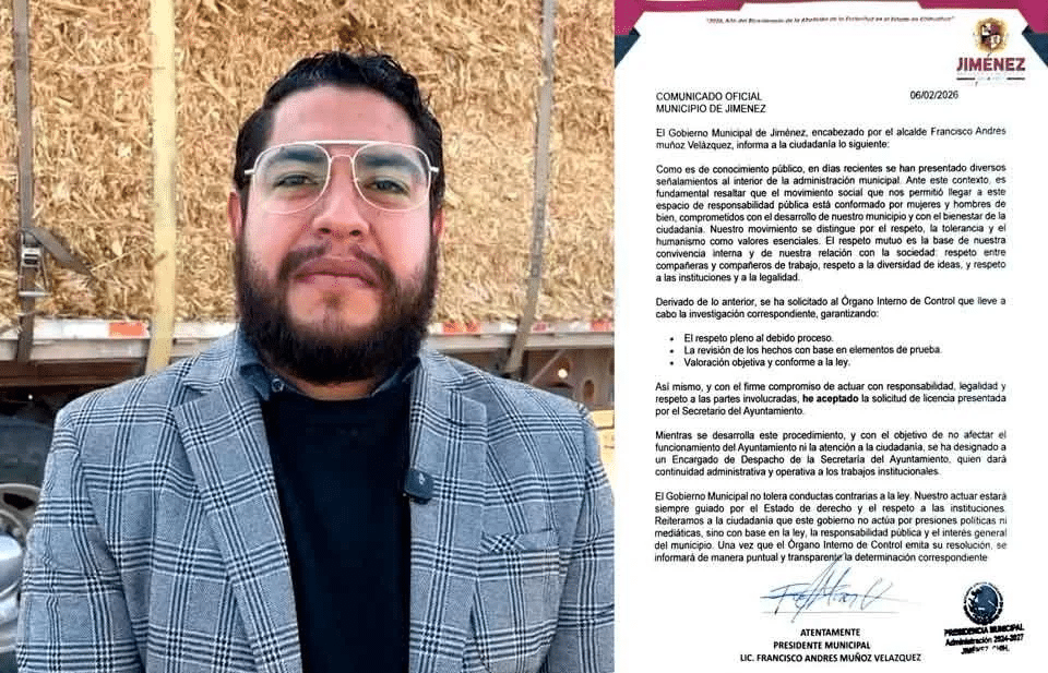 Parral, Chih.- El presidente municipal de Jiménez, Francisco Andrés Muñoz Velázquez, anunció a través de un comunicado oficial que el Secretario del Ayuntamiento Iván Venegas Servín fue retirado de su cargo para iniciar una investigación luego de haber sido acusado por la ex titular de la Instancia de la Mujer por amenazas y violencia política de género, así fue dado a conoccer a través de un comunicado.