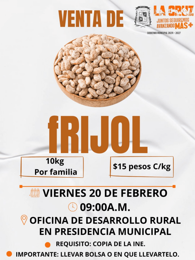 Con el objetivo de apoyar la economía de las familias del municipio, el Gobierno Municipal de La Cruz 2024–2027, a través de la Dirección de Desarrollo Rural, llevará a cabo una venta de frijol a precio accesible.